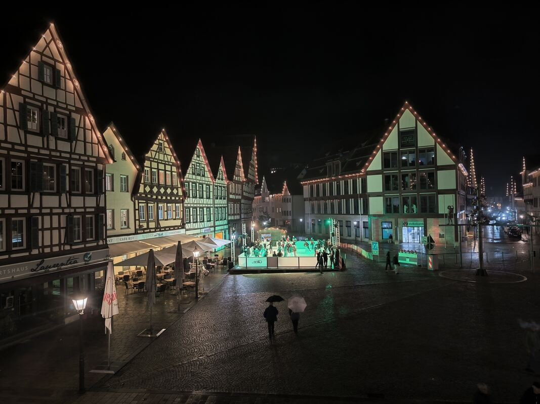 Die Bahn wurde direkt vor dem ehemaligen Oberamt aufgebaut und hat stattliche 170 Quadratmetern (17 auf 10 Meter) Fläche, hergestellt von der Schweizer Firma Glice. Eine Eisbahn, die ohne Eis auskommt. »Glice-Synthetik-Eis wird aus hochmolekularem Polyethylen hergestellt. Seine Haupteigenschaften sind die lange Haltbarkeit und der geringe Verschleiß, die es ideal für die Verwendung als synthetisches Eis machen.«
