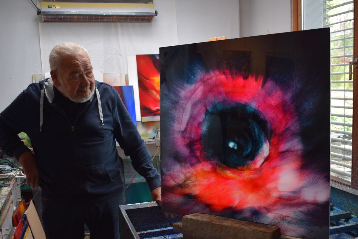 Hans Fritz und sein Bild »Das schwarze Loch« aus seiner jüngsten Schaffensperiode. Mehr Bilder des Kunstschaffenden sind vom 19. Mai bis zum 2. Juni in der Inneren Kelter in Neuhausen zu sehen. FOTO: FÜSSEL