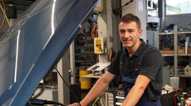 Der 18-Jährige aus Hülben absolviert sein drittes Ausbildungsjahr zum Kraftfahrzeugmechatroniker beim Autohaus Kurt Schneider GmbH in Bad Urach. Hier schraubt er unter anderem an Motoren, führt Inspektionen oder Fehlersuchen durch und ist bei der Reparatur von Unfallschäden dabei. »Im Handwerk bin ich richtig«, stellt Greiner zufrieden fest. Bis zu dieser Erkenntnis hat es jedoch, wie bei so vielen jungen Menschen, erst einmal Orientierung benötigt. Irgendwas mit Technik sollte es sein, welcher Bereich genau, das musste sich erst noch zeigen. Drei Praktika, eines im elterlichen Schornsteinfegerbetrieb, eines als Zweiradmechatroniker und schließlich eines in seinem heutigen Ausbildungsbetrieb, brachten den leidenschaftlichen Schrauber zu seinem Traumjob.