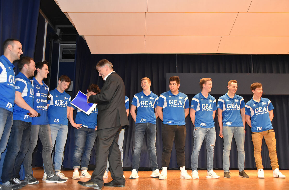 Viel zu lachen hatte die Handballmannschaft Echaz-Ermstal, als sie für ihre Leistungen mit dem EnBW-Sonderpreis von Karl-Heinz Walter geehrt wurde. FOTO: SANDER