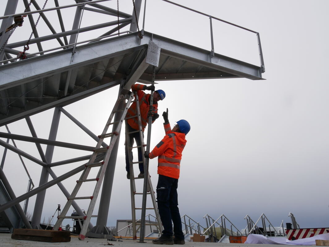 Die Männer von Stahlbau Urfer (Remseck) arbeiten sich zügig in die Höhe. Hier montieren sie gerade das dritte von acht Treppenelementen. Wenn alles fertig ist, kann man auf knapp 20 Meter über dem Fundament über die Alb blicken.