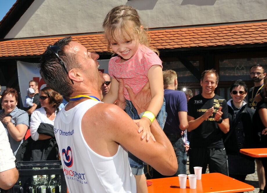 Mit Marathon-Sieger Peter Keinath strahlt sein Töchterchen im Ziel um die Wette.