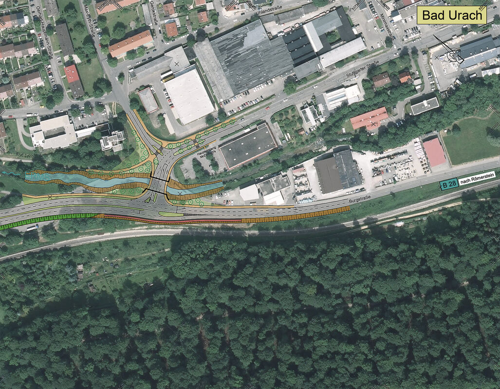 Die Hochhauskreuzung: Der Plan zeigt, dass die B 28 auch in diesem Bereich aufgeweitet wird, die Fahrzeuge also auf vier statt wie bisher zwei Spuren rollen. Weil die Bundesstraße verschwenkt wird, rückt sie dicht an die Gleise der Ermstalbahn. Auch die Erms wird verlegt, sie kommt im Bereich des Hochhauses mehr ans Tageslicht.