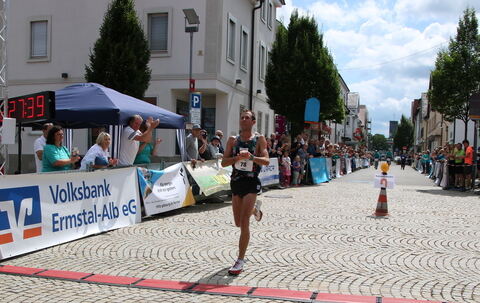 Gleich zwei Streckenrekorde hielt Sabrina Mockenhaupt-Gregor bis gestern, beide musste sie abgegeben: Corinna Coenning von der LG Glems kam auf der Halbmarathon-Strecke nach 1:17:38 ins Ziel und unterbot die bisherige Bestzeit von 1:20:26 deutlich. Leah Hanle (TSV Holzelfingen) heißt die Siegerin auf der 10-Kilometer-Strecke, nach 34:38 Minuten erreichte sie den Kelternplatz vor Sabrina Mockenhaupt-Gregor. In die Siegerlisten reihten sich zudem Anthony Tomsich (LAV Stadtwerke Tübingen) im Halbmarathon (1:11:09) und Silvan Rauscher (TSG Münsingen) über die zehn Kilometer ein, exakt 31 Minuten brauchte er von Bad Urach bis auf den Kelternplatz.