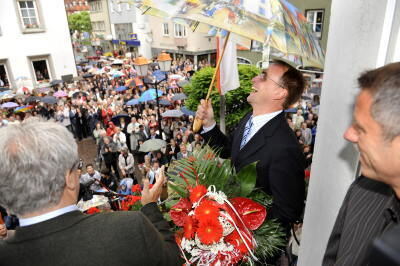 Markus Ewald auf dem Balkon des Rathauses Weingarten nach der Bekanntgabe des Wahlergebnisses durch Noch-Oberbürgermeister Gerd Gerber (links) und Bürgermeister Rainer Kapellen.