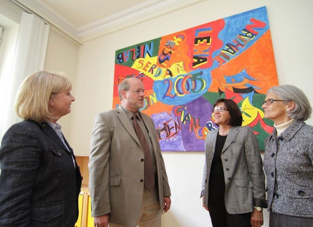 Die drei von der Spendensammelstelle: Dorothea Henzler (links), Hanni Winter und Ursula Dettinger-Müller vom Inner Wheel Club Neckar-Alb sprechen mit Michael Fischer, dem Leiter der Uracher Wilhelmschule, über Probleme von Förderschulen.