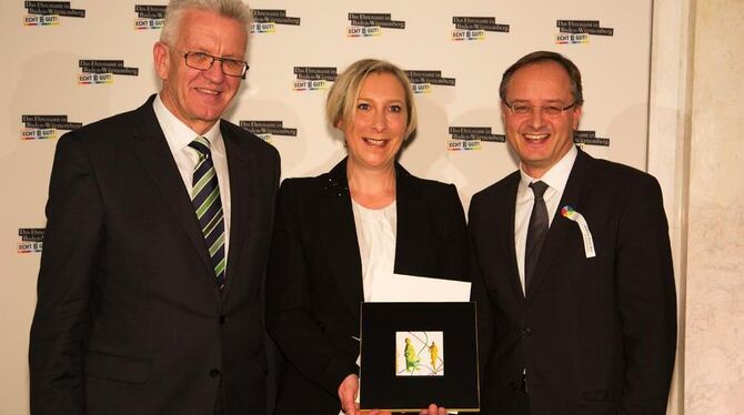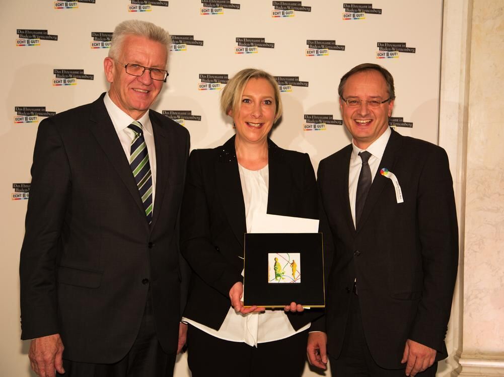 Kirsten Gaiser-Dölker aus Gomaringen bei der Preisverleihung mit Ministerpräsident Kretschmann und Kultusminister Andreas Stoch. »Dadurch dass der Förderverein Leichtathletik Gomaringen offen auf die Kinder zugeht, haben wir viele erreicht. Ungefähr 300 Kinder sind durch ’Wir bewegen was!’ für die Leichtathletik begeistert worden.«, freute sie sich. FOTO: VISUELL