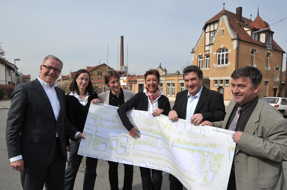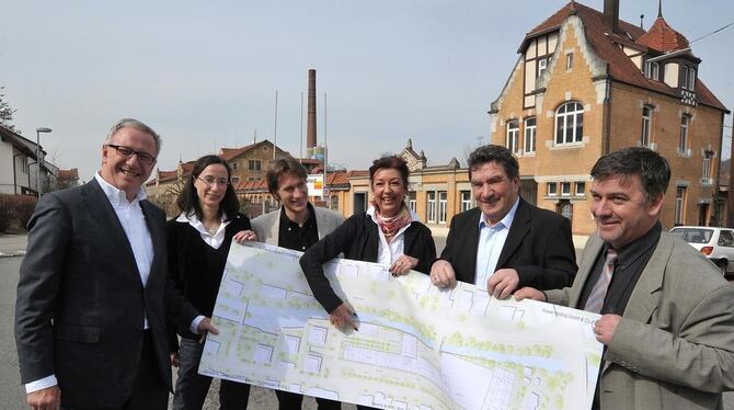 Projektpartner für Dettingens heikle Ortssanierung III: von links Architekt Wolfgang Riehle, Domino GmbH, Sybille Rosenberg und Martina Mayer-Rauch von der mit der Gemeinde kooperierrenden Stadtentwicklung GmbH, dazwischen Diplom-Ingenieur Albrecht Reuß, Uniplast-Firmenchef Karlheinz Knauer und Dettingens Bürgermeister Michael Hillert.