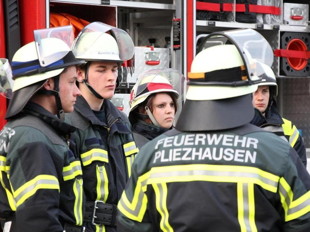 Mittendrin und voll bei der Sache: Johanna Zimmermann im Kreise ihrer Pliezhäuser Feuerwehrkollegen bei einer kurzen theoretischen Unterweisung, bevor es galt, das bisher Gelernte in einer Übung unter Beweis zu stellen. FOTO: MAZ
