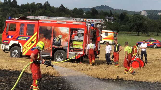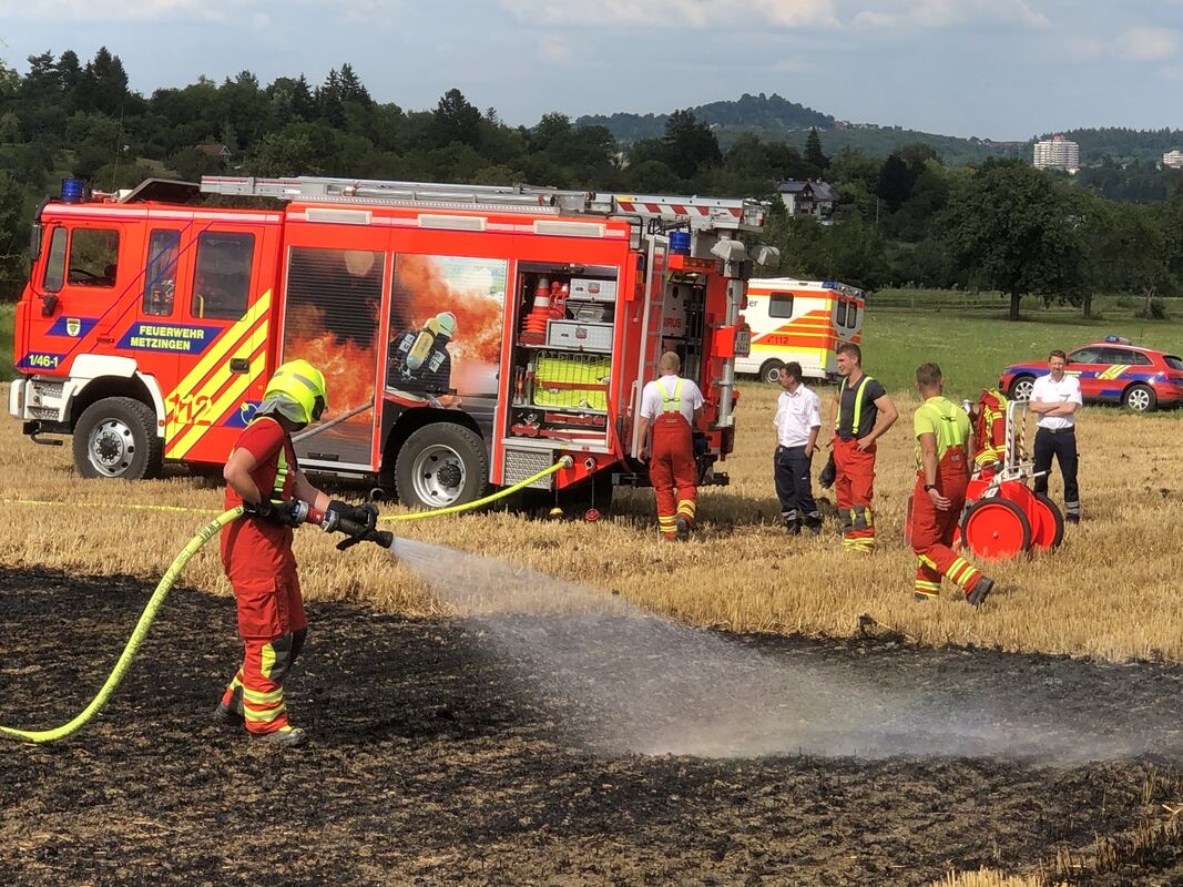 METZINGEN. Gegen 16 Uhr waren mehrere Notrufe wegen des Brands auf dem Feld bei der Leitstelle für Feuerwehr und Rettungsdienst in Reutlingen eingegangen. Noch vor Eintreffen der Feuerwehr versuchte ein Nachbar, das Feuer mit mehreren Feuerlöschern einzudämmen. Dennoch zeigte eine große Rauchsäule den Einsatzkräften den Weg links der Landesstraße Richtung Reicheneck. Den Feuerwehrleuten gelang es, das Feuer einzudämmen und schließlich zu löschen. Insgesamt brannte eine Fläche von rund 500 Quadratmeter.