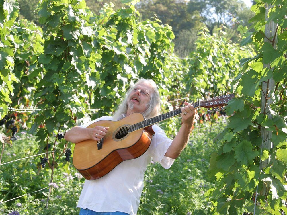 Walter Dieterle mit rauchiger Stimme und zwölfseitiger Gitarre inmitten der Weinbergreben.