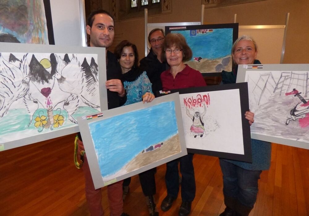 Künstler Abdulhamid Hassoun mit Nadia Glatzel, Klaus Stramm, Ursula Moravek (alle vom AK Asyl) und Sylvia Lechler von der Kunstwerkstatt Kiwi (von links). FOTO: BÖRNER