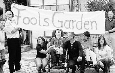 Die Fan-Gemeinde freut sich schon auf den Open-Air-Auftritt von Fools Garden anlässlich des Diakonie-Festivals in Dettingen: Der Leiter der Behindertenhilfe im Ermstal, Friedemann Salzer (links), und der Chef der Behinderten-Werkstatt in der Schwalbenstadt, Gerhard Droste (rechts), zusammen mit ihren Schützlingen und deren Betreuern.