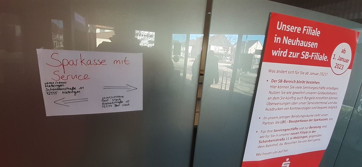 Nach der Umstellung der Neuhäuser Sparkassenfiliale auf SB-Betrieb Anfang des Jahres weist ein Schild auf die zwei und zehn Kilometer entfernten personenbedienten Filialen in Metzingen und Bad Urach hin. Eine dritte liegt in Dettingen.