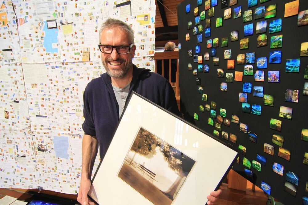 Bücherei-Leiter Ulrich Koch vor der Wand mit (rechts) Lochkamera-Bildern und (links) Briefumschlägen, in denen die »Fotografen« die Filmdöschen dem Stuttgarter Straßenkünstler zurückgeschickt haben. In seinen Händen hält er ein Lochkamera-Bild, das er Przemek Zajfert abgekauft hat.