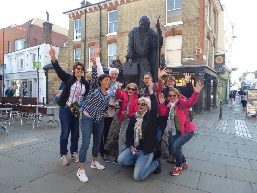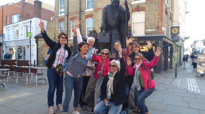 Die Pilgerinnen vor der Statue von Geoffrey Chaucer, dessen Buch Beate Mayer (knieend) zur Reise inspiriert hat.