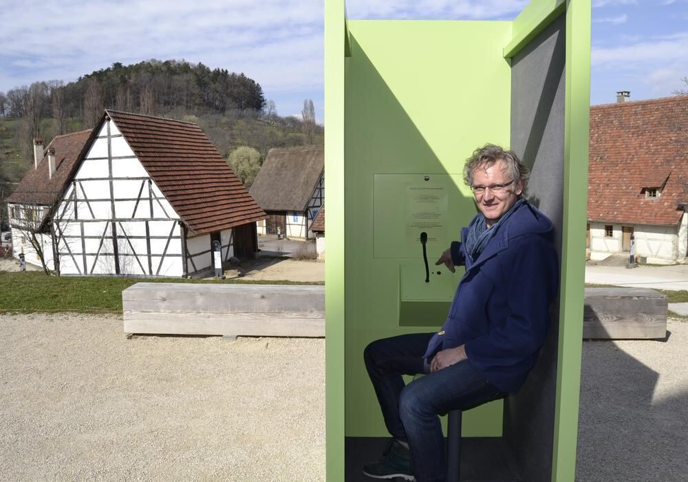 Ganz schön leuchtend grün ist die schmale Sprachbox von Künstler Tobias Ruppert. Er hat sie extra für die neue Saison im Freilichtmuseum Beuren gebaut. Hier sollen Besucher auf den Knopf neben dem Mikrofon drücken und dann ihre schönste Alltagsgeschichte aus dem letzten Jahr erzählen. Daraus soll am Ende eine szenische Lesung entstehen. FOTO: RITTGEROTH