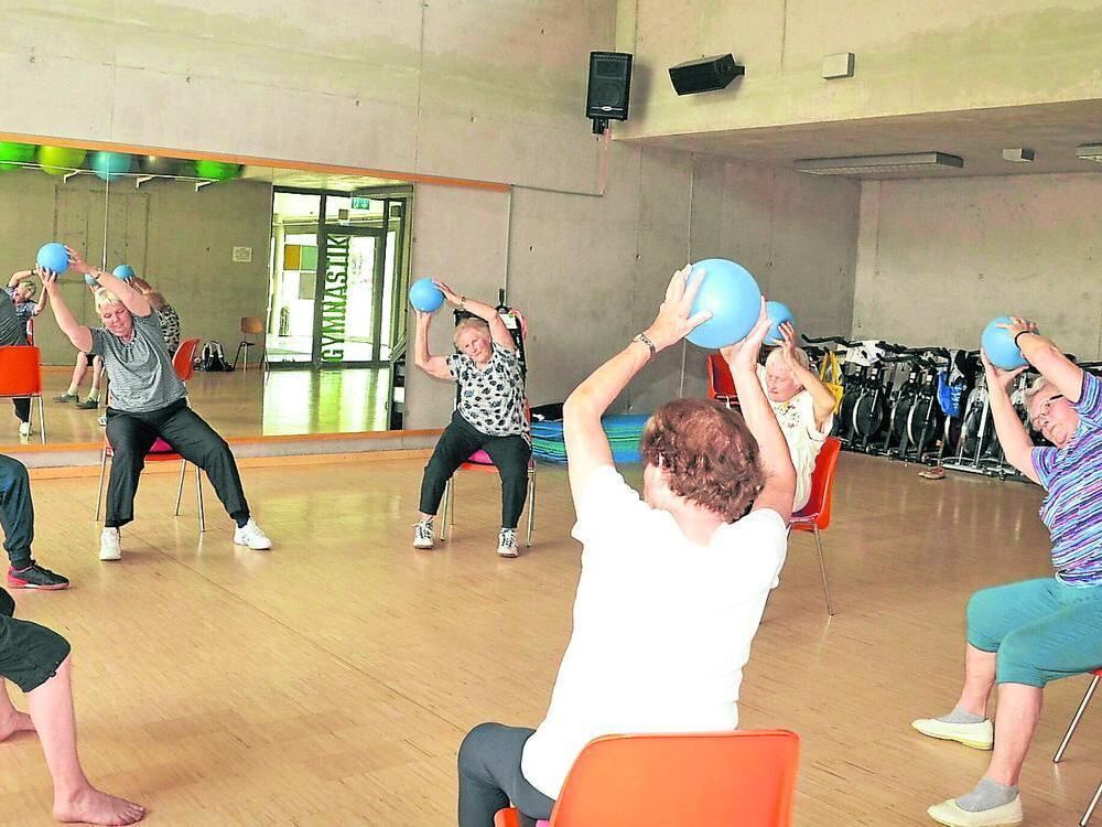 Rumpfkreisen mit Bällen in den Händen: eine der Übungen in der Gymnastikgruppe im Sportzentrum Ösch, die viele Muskeln im Oberkörper trainiert und die Beweglichkeit zu erhalten hilft.