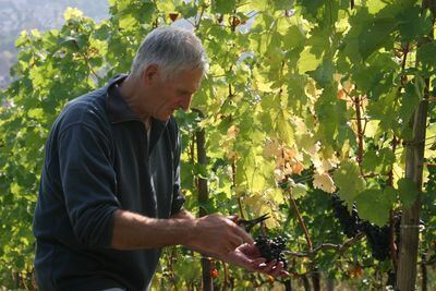 METZINGEN. Dieser Tage ist Portugieser-Zeit in den Weinbergen von Metzingen und Neuhausen. In sattem Dunkelblau hängen die Trauben am Stock. Die Wengerter wollen jetzt mit der Lese nicht mehr länger warten und greifen geübt zur kleinen Spezialschere. So machen es auch Heinz und Lilli Reusch, die zusammen 23 Ar bewirtschaften. Auf 5,5 Ar stehen noch recht junge Portugieser-Reben, die jetzt erstmals einen Ertrag bringen. Nicht allzu viel, aber immerhin. 40 Kilogramm pro Ar erntet Heinz Reusch.