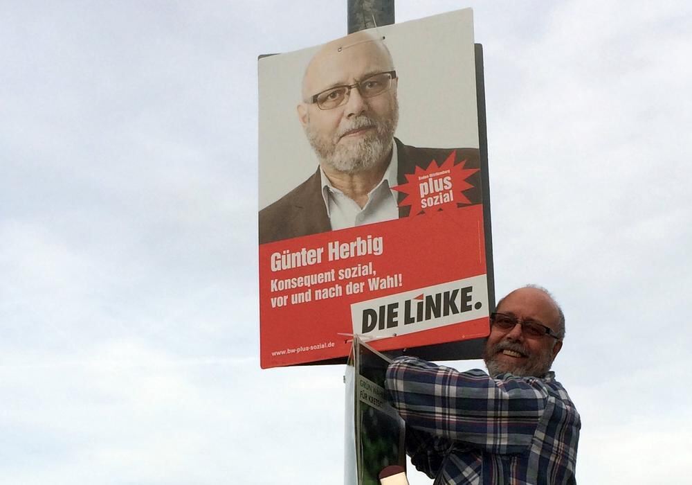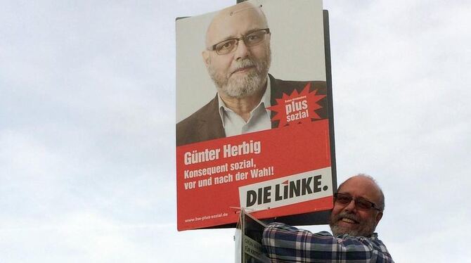 Selbst ist der Mann: Günter Herbig beim Plakatieren. Den ganzen »Bananenwahlkreis« Hechingen-Münsingen bis zum Wahltermin am 13. März mit seinem Konterfei abzudecken, werde ihm wohl nicht gelingen, meint er bedauernd. FOTO: PRIVAT