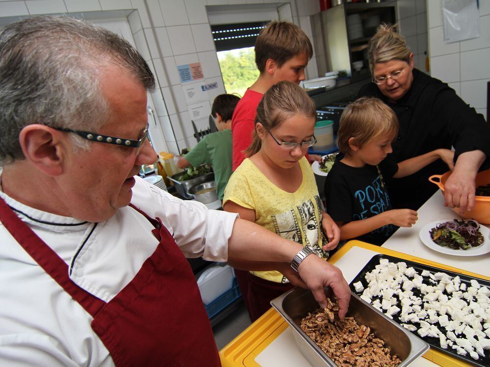 Edwin und Marion Bosler von der Stadiongaststätte des SV Hülben zeigen den Kindern, wie man einen schicken Pflaumen-Käse-Salat mit Ziegenkäse anrichtet. Danach gab's Spanferkel, zum Nachtisch Birnen-Auflauf mit Mandelstrudel und Vanilleeis.