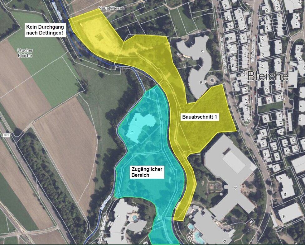 Ein Übersichtsplan zeigt deutlich, welche Flächen von der Sperrung betroffen sind (gelb markiert) und welche Bereiche weiterhin öffentlich zugänglich bleiben (blau markiert).