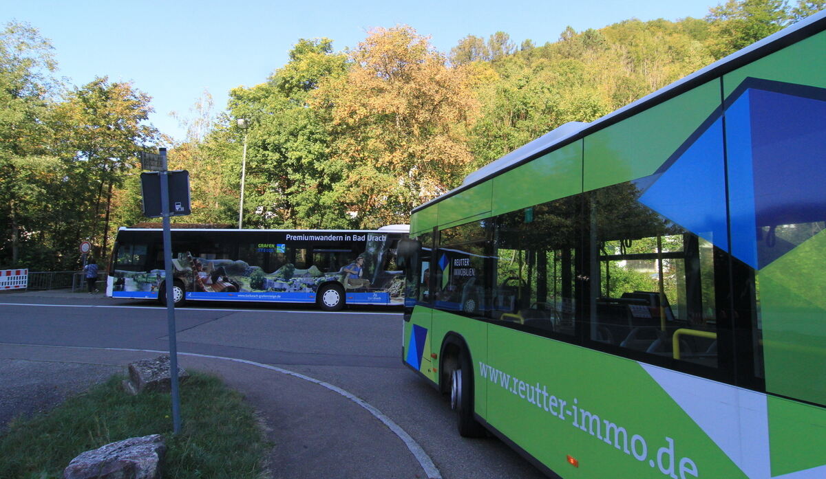 Zwei Busse des Uracher Stadtverkehrs an der Endhaltestelle Hans-Reyhing-Weg.