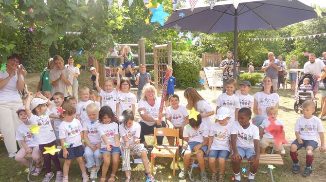 Mit fröhlichen Liedern und einer kleinen Tischrakete, die Sterne regnen ließ, wurde jetzt der Bau des Rienzbühlkindergartens gefeiert. Dieser ist 50 Jahre her. FOTO: SANDER
