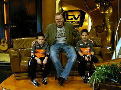 Fototermin nach getaner Arbeit: Die beiden Tischfußball-Meister Nico (links) und Maurizio Klasen aus Pliezhausen traten am Dienstagabend gegen Stefan Raab (Mitte) am Kicker an. Heute wird das Match im Fernsehen ausgestrahlt.