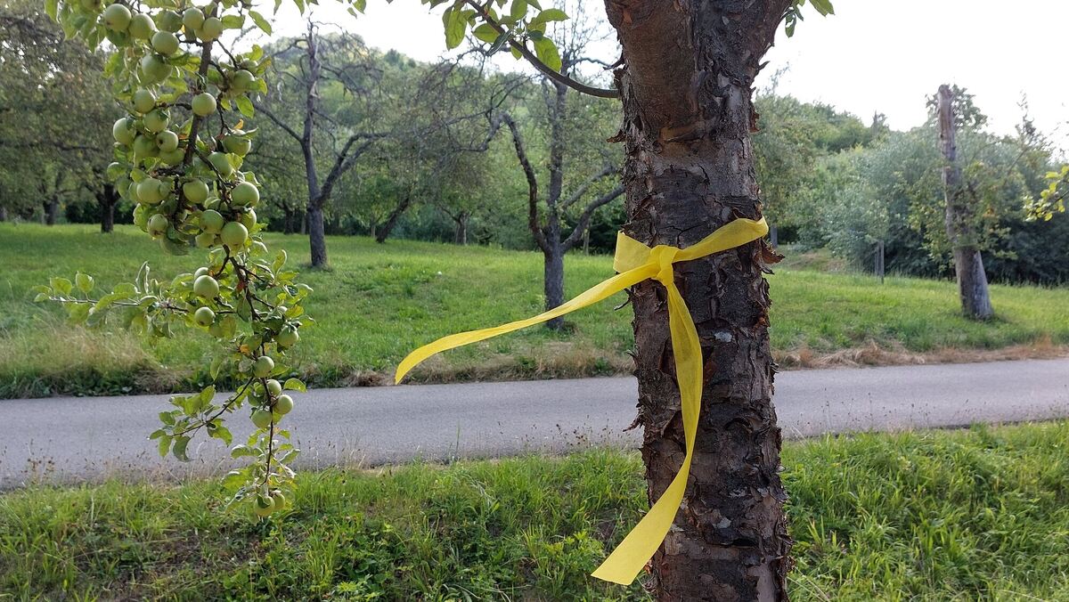 »Ein gelbes Band an einem Baum signalisiert, dass hier das Obst kostenlos und ohne Rücksprache mit dem Besitzer geerntet werden darf«, erklärt Anja Kurz. Die städtische Mitarbeiterin weist darauf hin, dass manchmal Äpfel, Birnen und Zwetschgen von den Wiesen nicht geerntet werden, weil die Eigentümer das viele Obst nicht verwerten können oder verhindert sind, sei es urlaubsbedingt oder auch krankheitsbedingt.