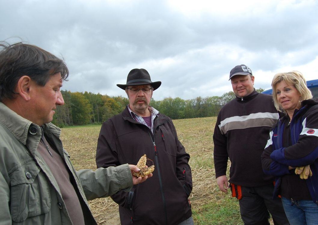 Jochen Krohmer mit Maisresten, die die Erntemaschine verfehlt hat, Mario Klein, Holger Weiland und Sabine Schmidt an einem abgeernteten Feld am Albtrauf bei Neuhausen. Angelockt von solchen Resten, kann das Wild auch Schäden an neuer Einsaat verursachen. FOTO: PFISTERER