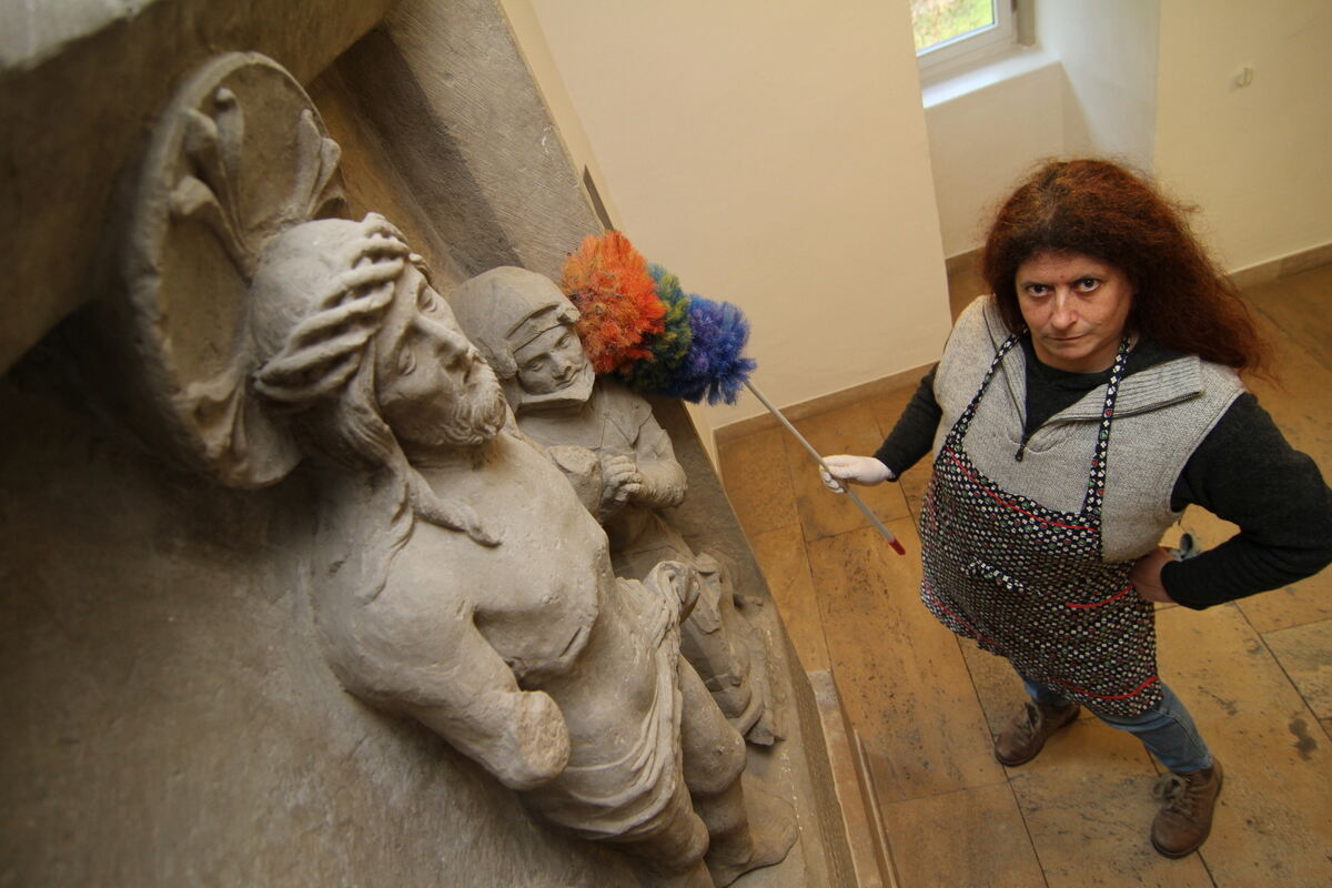 Putzfrau Rosi alias Johanna Kugele staubt den Hausherrn Graf Eberhard ab. Auch in Zeiten der Pandemie. Die Verwalterin des Uracher Residenzschlosses hat die Figur erfunden, um Geschichte erfrischend anders zu präsentieren. FOTO: ANDREAS FINK