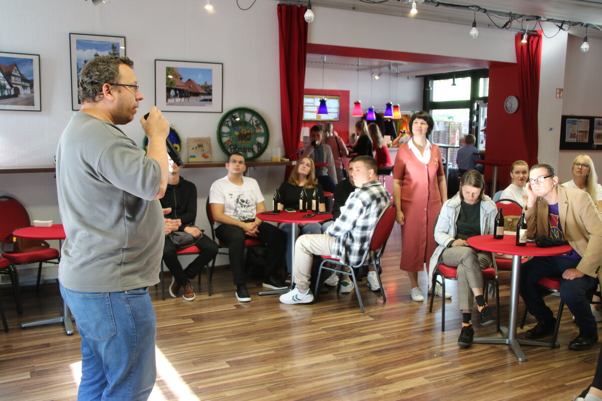 Auch Alex Kvitka berichtet im Café Kyjiw über seiner Erfahrungen, der 43-Jährige Ingenieur für Vermessungstechnik arbeitet bei der Stadt Metzingen