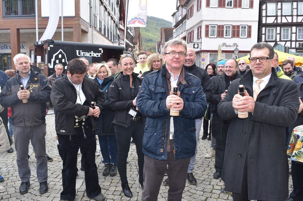 Dem einen oder anderen war es zwar mehr nach Glühwein, doch eröffnet wurde die Gewerbeschau in Bad Urach mit einem lauten Plopp der Bier-Bügelflaschen.