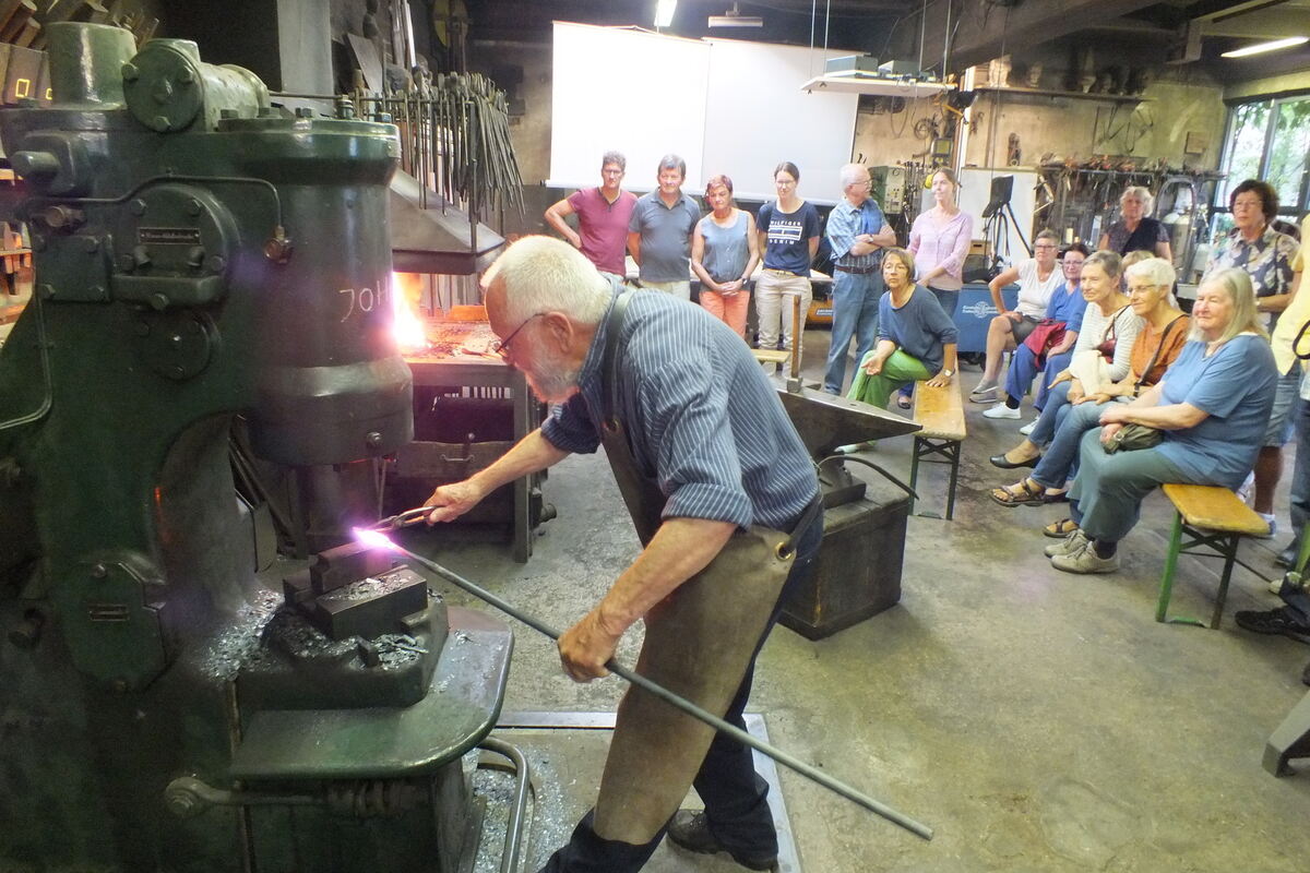 Von der Linde im Pliezhäuser Entenhof, einem der ältesten Dorfbereiche von Pliezhausen, mit einem seltenen, von Paul Zimmermann gestalteten und mit Sinnsprüchen verzierten Baumgitter, ging es zum Nagelbaum am Eingang zum Wohnhaus, wo jeder Praktikant und Wandergeselle, der um Arbeit und Lohn vorsprach, einen selbst geschmiedeten Nagel als bleibendes Erinnerungsstück zurücklassen musste und weiter in die Werkstatt, wo Paul Zimmermann die Steinkohle zum Glühen brachte. (hek)