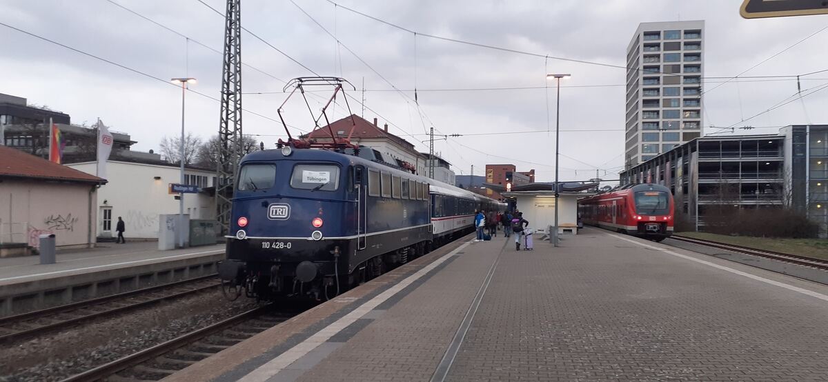 In Reutlingen Hbf wird die stündliche RB 63 (rechts) aus Bad Urach von MEX-18- und MEX-12-Zügen (Osterburken/Heilbronn – Tübingen) überholt. Links ein MEX 12, geschoben von einer in den Look der Sechzigerjahre zurückversetzten langlebigen E-Lok. Nach der Überholung kann die RB 63 nach Tübingen und Herrenberg fahren.