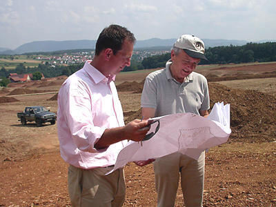 Wir bauen uns einen Golfplatz: Frank Hagen Spanka (links), Geschäftsführer des Golfclubs Hammetweil, und Architekt Reinhold Weishaupt auf dem Herrenabschlag von Bahn »Achalmblick«, der demnächst mit Quarzsand befüllt wird.