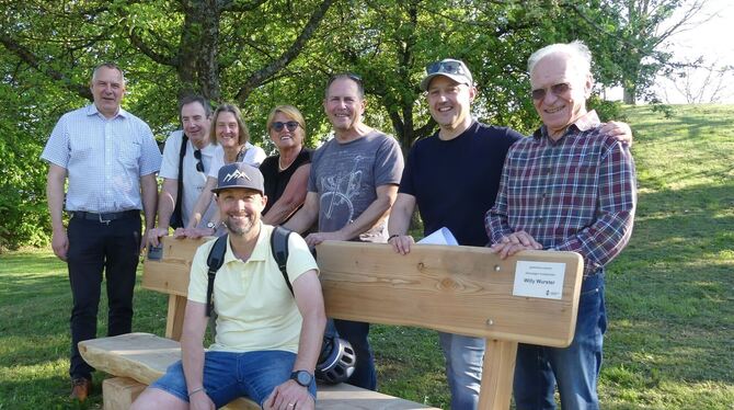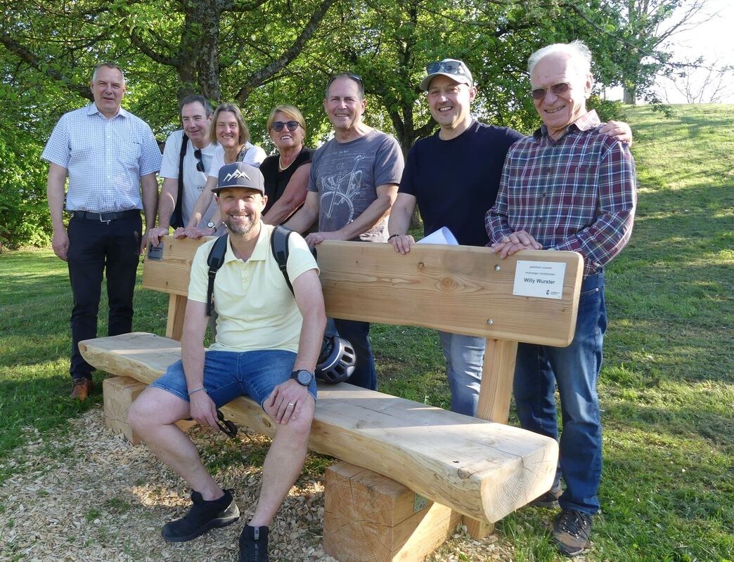 »Willy Wurster ist unser Dauerläufer, Müllsammler und Gipfelstürmer. Wer ihn kennt, weiß, er kann einfach nicht stillsitzen«, würdigte Defrancesco das hohe ehrenamtliche Engagement von Wurster, der seit 1964 »im Verein ordentlich mit-mischt, erst als Vorstand, dann als Wanderwart und sowieso immer, wenn irgendwo Arbeit anstand«. Außerdem sei Wurster seit Gründung der Radsportgruppe vor 25 Jahren »unser schnellster und sympathischster Windschatten«, so der Vorstandsteamsprecher. Darum »be-kommt er von uns, dem Vorstand und Ausschuss, jetzt endlich, was ihm gebührt – eine eigene Aussichtsbank. Nicht zum Ausruhen, sondern zum Planen der nächsten großen Tour.«