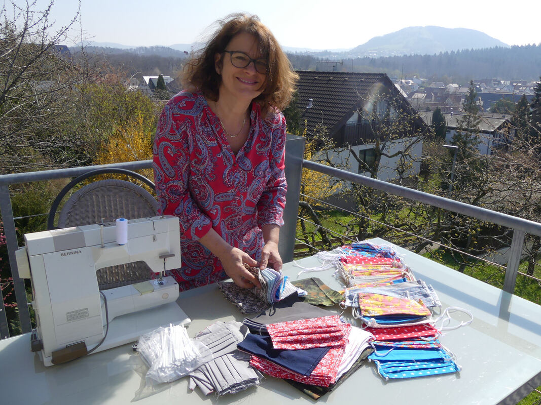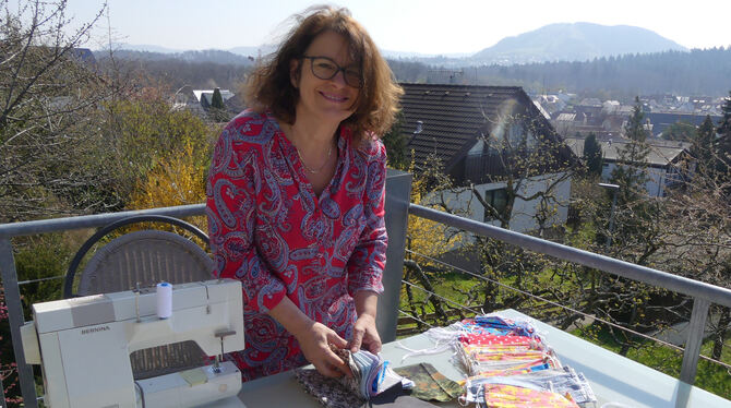 Bärbel Bauder stellt bei Sonnenschein ihre Nähmaschine auf den Balkon. Solange Stoff und Zubehör reichen, läuft die Masken-Produktion. FOTO: SANDER