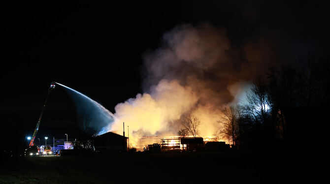 RIEDERICH. Großeinsatz für die Rettungskräfte am Samstagabend in Riederich: Gegen 19 Uhr ist in der Zimmerei Schnizer, in der Industriestraße, parallel zur Bundesstraße 313, ein Feuer ausgebrochen. »Es gab eine relativ lange Vorbrandphase«, berichtet Metzingens Feuerwehr-Kommandant Hartmut Holder dem GEA noch am Brandabend. Auch seine Feuerwehr ist zum Einsatz ausgerückt. »Als wir eingetroffen sind, war die Rauchentwicklung groß. Dann gab es einen Flashover, und die Halle stand in Vollbrand.« Insgesamt rund 130 Feuerwehrleute aus Riederich, Metzingen und Reutlingen sind an diesem Samstagabend vor Ort. Dazu rund 30 Einsatzkräfte des Rettungsdienstes.