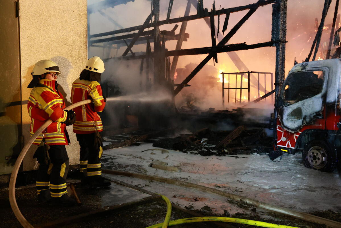 »Die Hitzeentwicklung war so massiv, dass dort teilweise Fenster geborsten und Rollläden geschmolzen sind«, so Holder. Auf dem Gelände der Zimmerei stand zudem ein Wohnwagen, in diesem waren Gasflaschen gelagert. Diese sind explodiert. Insgesamt ist ein Schaden von mindestens einer Million Euro entstanden.