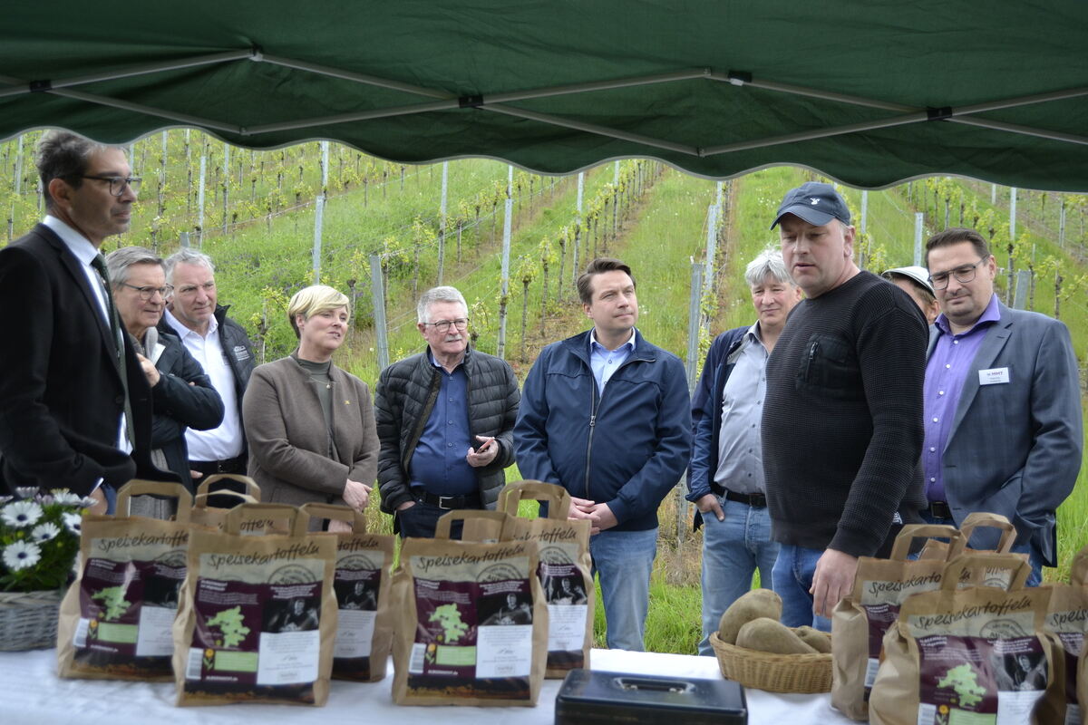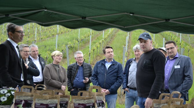 Timo Nau (Weid’Blick, St. Johann) steht für »g’scheide Kartoffeln von der Alb mit dem Geruch von Erde«. Ihm schauen über die Schulter (von links) Staatssekretär Dr. Andre Baumann (Grüne), MdL Rudi Fischer (FDP), der Geschäftsführer der Weingärtnergenossenschaft Jörg Waldner, MdL Cindy Homberg (Grüne), Metzingens CDU-Stadtrat Albert Welz, MdL Manuel Hailfinger (CDU), der Leiter der Biospährengebiets-Geschäftsstelle Achim Nagel und Metzingens Erster Bürgermeister Patrick Hubertz. FOTO: RUOF