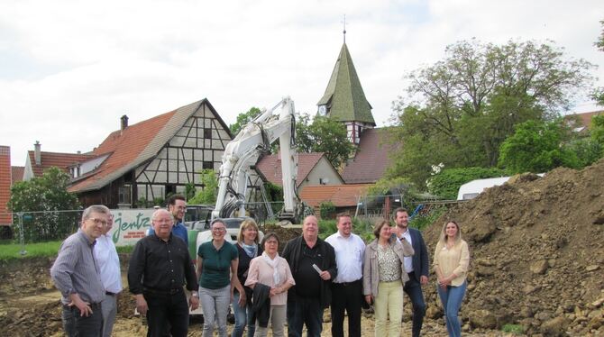 Beteiligte des Erweiterungsbaus für das Altenpflegeheim freuen sich, dass der Bagger bereits zu arbeiten begonnen hat. FOTO: MÜLLER