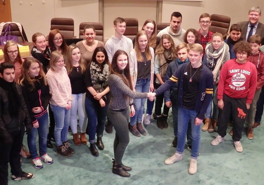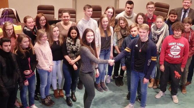 Michelle Grigoruk und Edwin Rausch geben sich symbolisch für die abtretenden und die neuen Jugendgemeinderäte die Hände. FOTO: VEIT