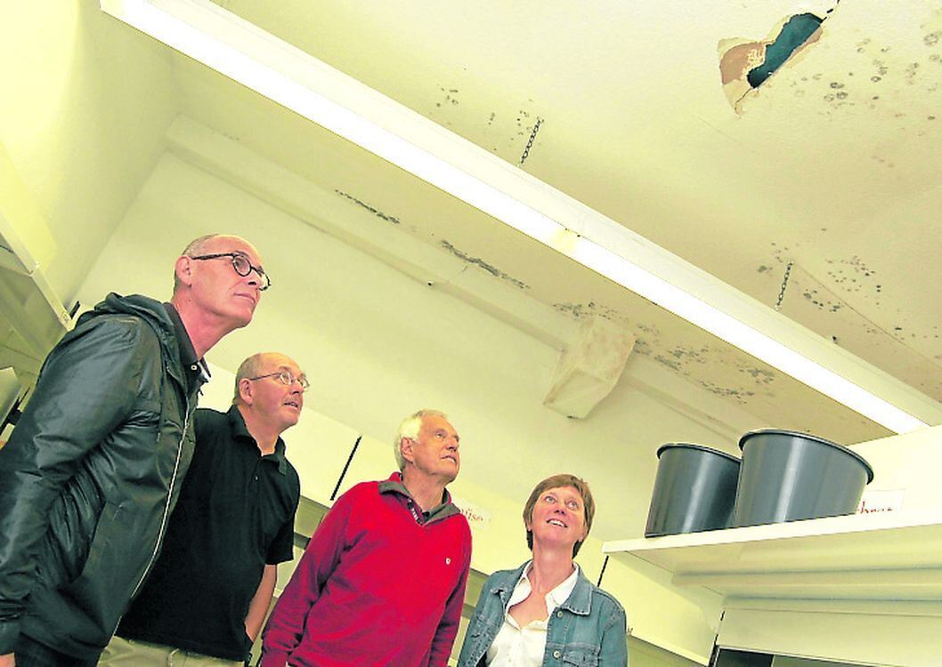 Ein Riss in der durchhängenden Decke, auf den Regalen Eimer zum Wasserauffangen statt Toastbrot. Michael Breuer, Ulrich Vogel, Hans-Dieter Schwarzmann und Susanne Bauer (von links) vom Team der Tafel hoffen auf schnelle Schadensbeseitigung. FOTO: PFISTERER