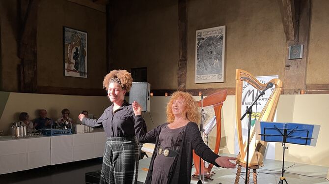 Harfenklänge im ehrwürdigen Neuhäuser Bindhof: Nancy Cornwell (rechts) mit ihrer jungen Kollegin Mai Gervais. FOTO: RUOF