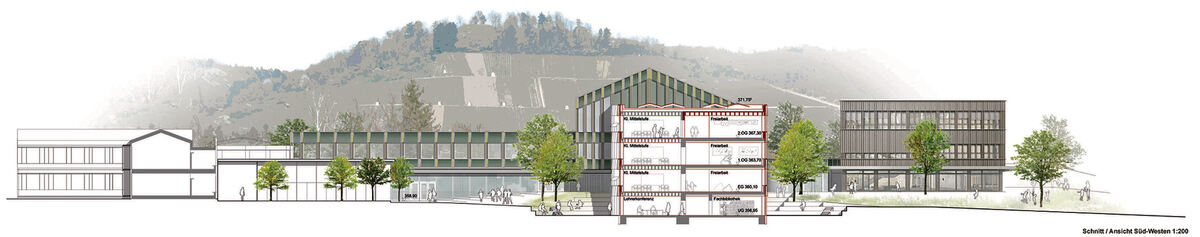 So könnte das sanierte Hauptgebäude des Metzinger Dietrich Bonhoeffer Gymnasiums 2030 aussehen. Die Sanierung und der neue Naturwissenschaftliche Trakt (rechts) sind Schwerpunkte im Investitionsprogramm der Stadt.