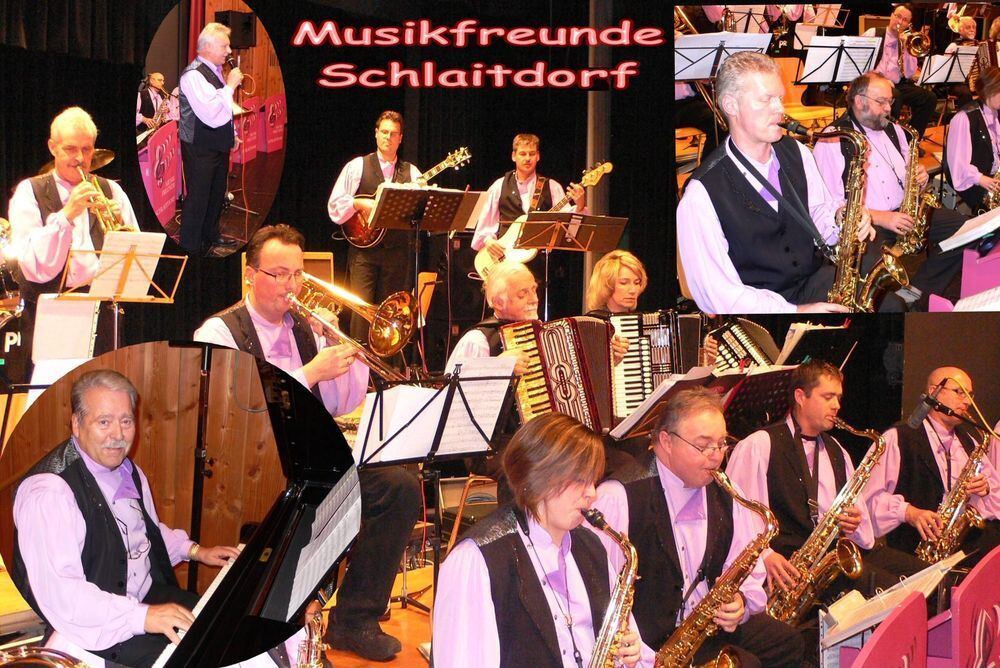 Die Big-Band der Musikfreunde Schlaitdorf füllte bei ihrem Tanz-Event locker die Melchiorfesthalle in Neckartenzlingen. Mehr als 300 Zuschauer waren von den Choreografien begeistert und ließen sich zum Selber-Tanzen nicht zweimal bitten. BILD-COLLAGE: ILLIG