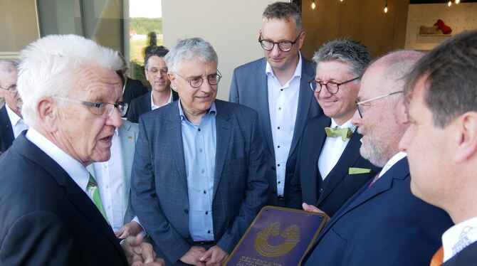 Auf eine wilde, virtuelle Fahrt mit einem keltischen Streitwagen begab sich Ministerpräsident Winfried Kretschmann am Freitag zusammen mit Staatssekretär Arne Braun im Heidengrabenzentrum.