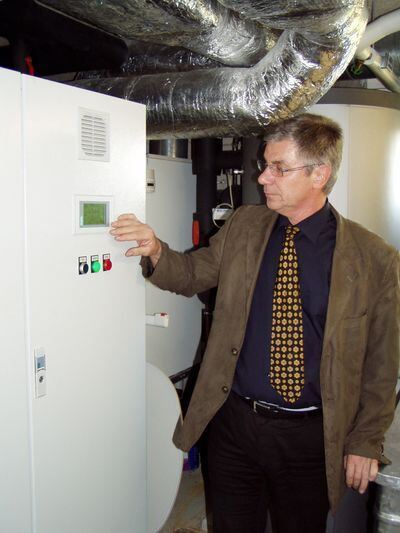Werner Kost an der Wärmepumpe, die sein Bürogebäude mit ausreichend Heizungsenergie versorgt.